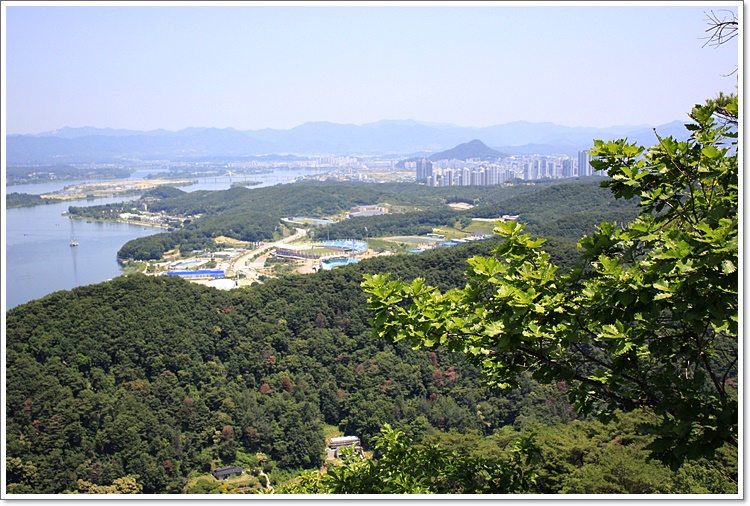 건너편으로 삼악산이 마주하고,저멀리 호반위로 삼악산 케이블카가 개미만하게 보인다.